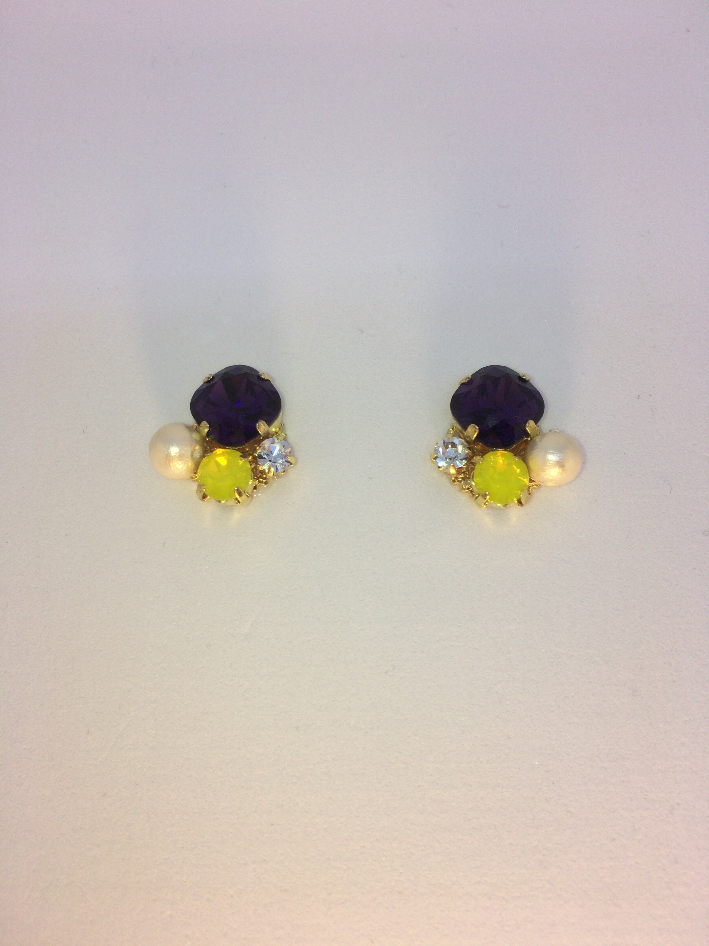 パープル×イエローレイカーズカラービジューピアス。